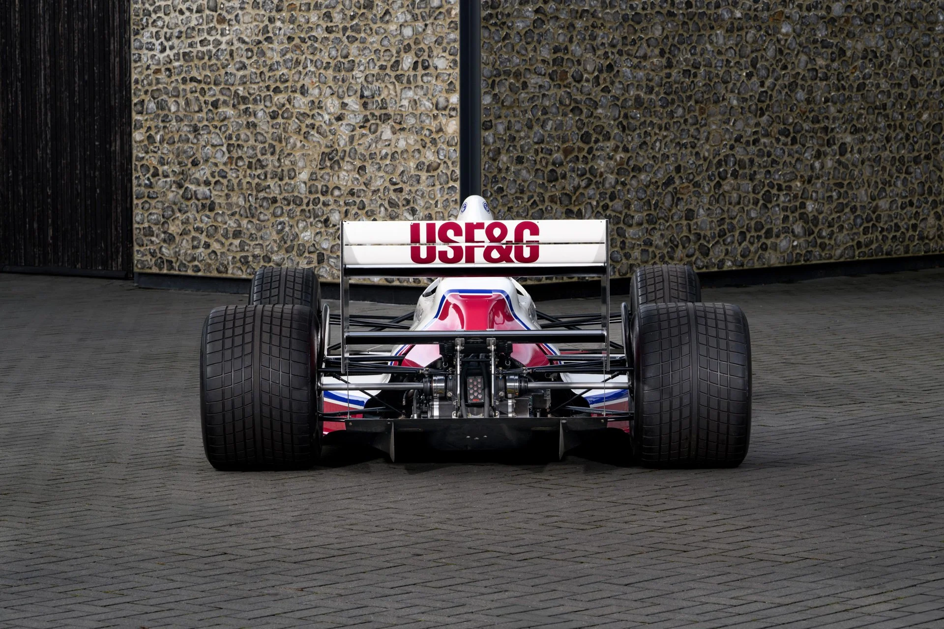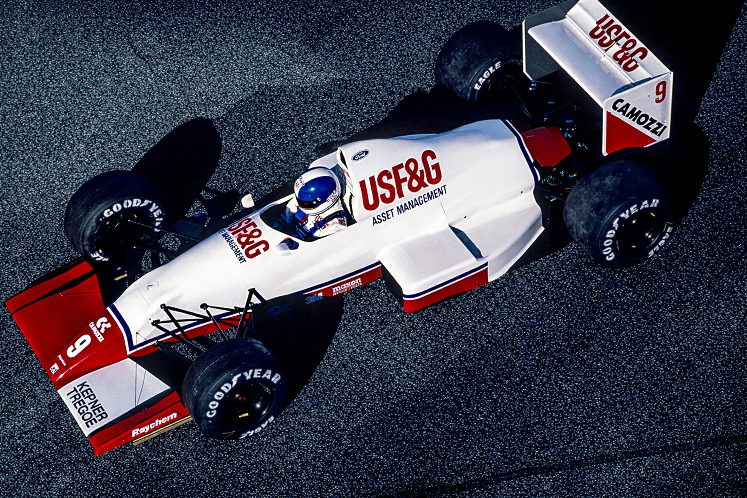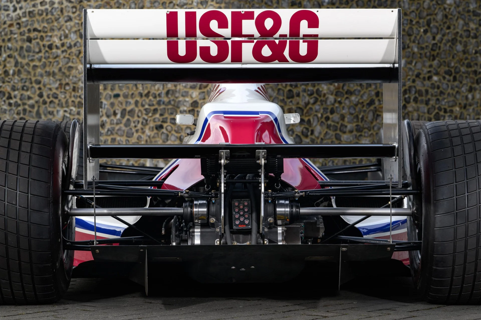 The engine cover was tightly draped over the customer specification Ford Cosworth DFR engine. The 3.5-litre V8 was officially rated at 605 bhp and was used as a fully stressed member of the chassis together with the proprietary Arrows gearbox. This was a transverse design that used Hewland internals and had six forward gears. Stopping power was provided by carbon-fibre composite discs supplied by AP Racing. The Arrows A11 was liveried in the USF&G corporate colours of white and dark red with a distinct asymmetrically finished front wing.