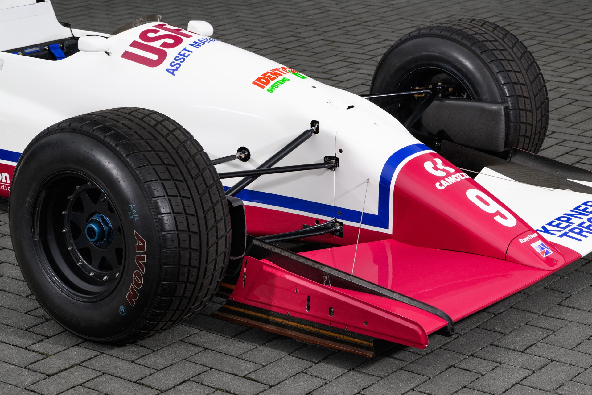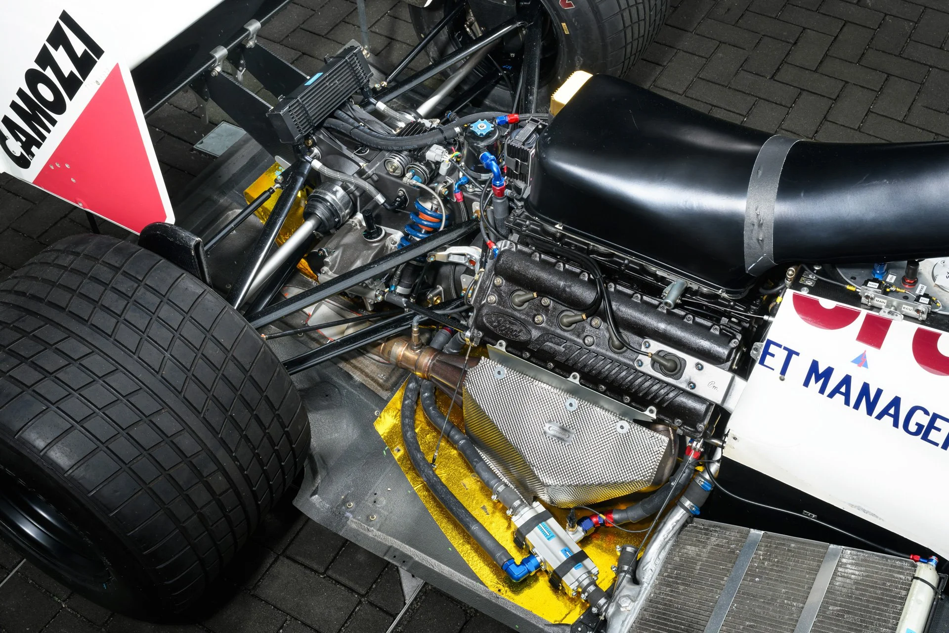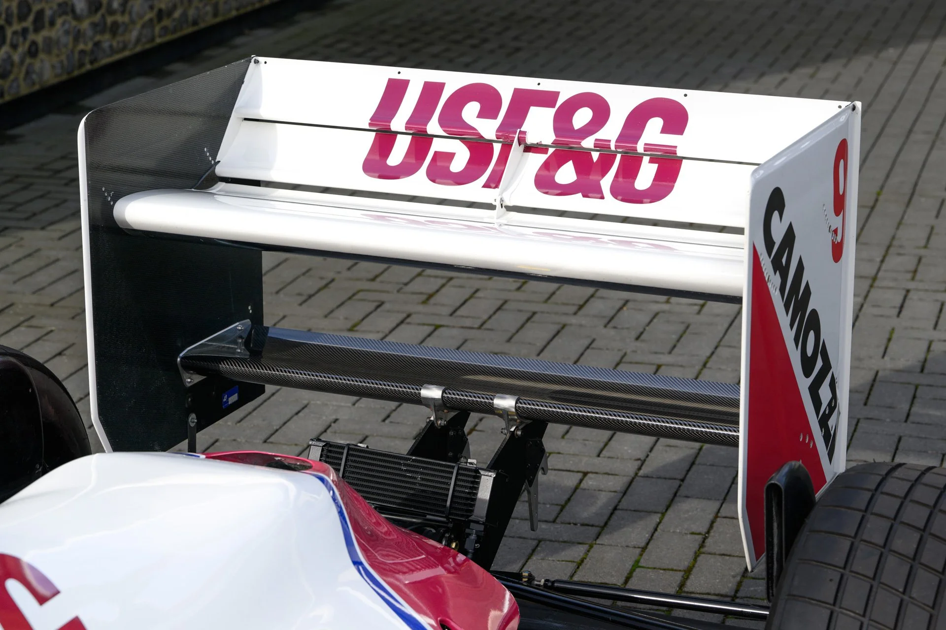 The engine cover was tightly draped over the customer specification Ford Cosworth DFR engine. The 3.5-litre V8 was officially rated at 605 bhp and was used as a fully stressed member of the chassis together with the proprietary Arrows gearbox. This was a transverse design that used Hewland internals and had six forward gears. Stopping power was provided by carbon-fibre composite discs supplied by AP Racing. The Arrows A11 was liveried in the USF&G corporate colours of white and dark red with a distinct asymmetrically finished front wing.