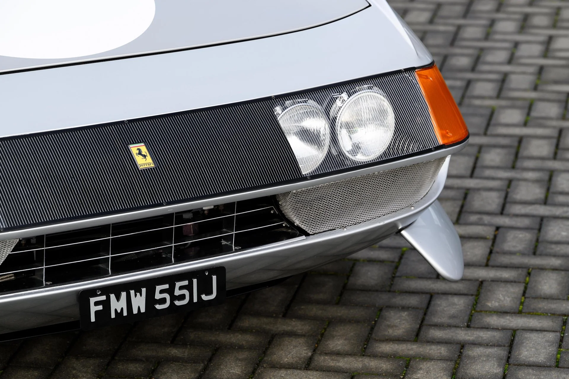 According to the work of marque historian Michael Sheehan and Ferrari historian Keith Blummel, chassis 14049 was built in January 1971, finished in Argento 106-E-1 (silver) with a black leather interior. Through French distributor Charles Pozzi, the car was acquired by its first owner, noted as a Mr Caillas. Mr Caillas’s time with the car is not known and he appears to have only owned the car briefly before it was sold on to fellow Frenchman Philippe Cornet-Epinat. A wealthy enthusiast, Cornet-Epinat had a taste for fast cars, owning an early Lamborghini Miura P400 and a Maserati Ghibli, with factory upgrades.